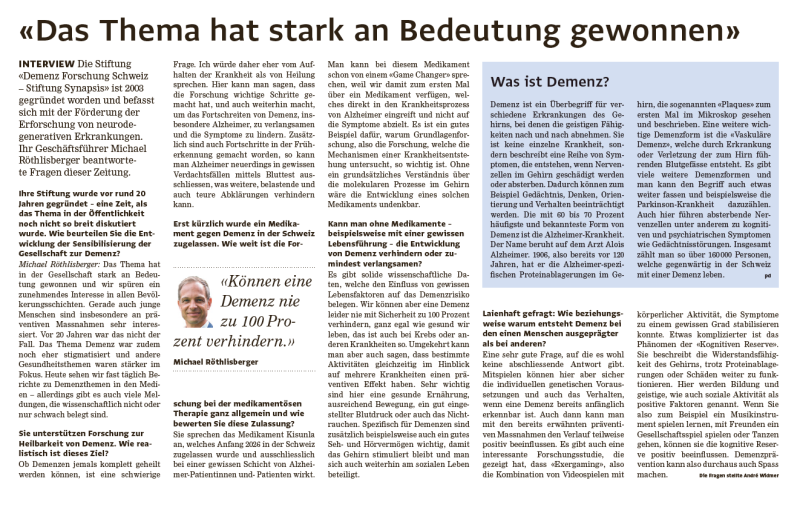 Im Interview mit der Zeitung Seetal spricht unser Geschäftsführer Dr. Michael Röthlisberger über die wachsende Bedeutung von Demenz, aktuelle Fortschritte in der Forschung und warum das Thema uns alle betrifft.